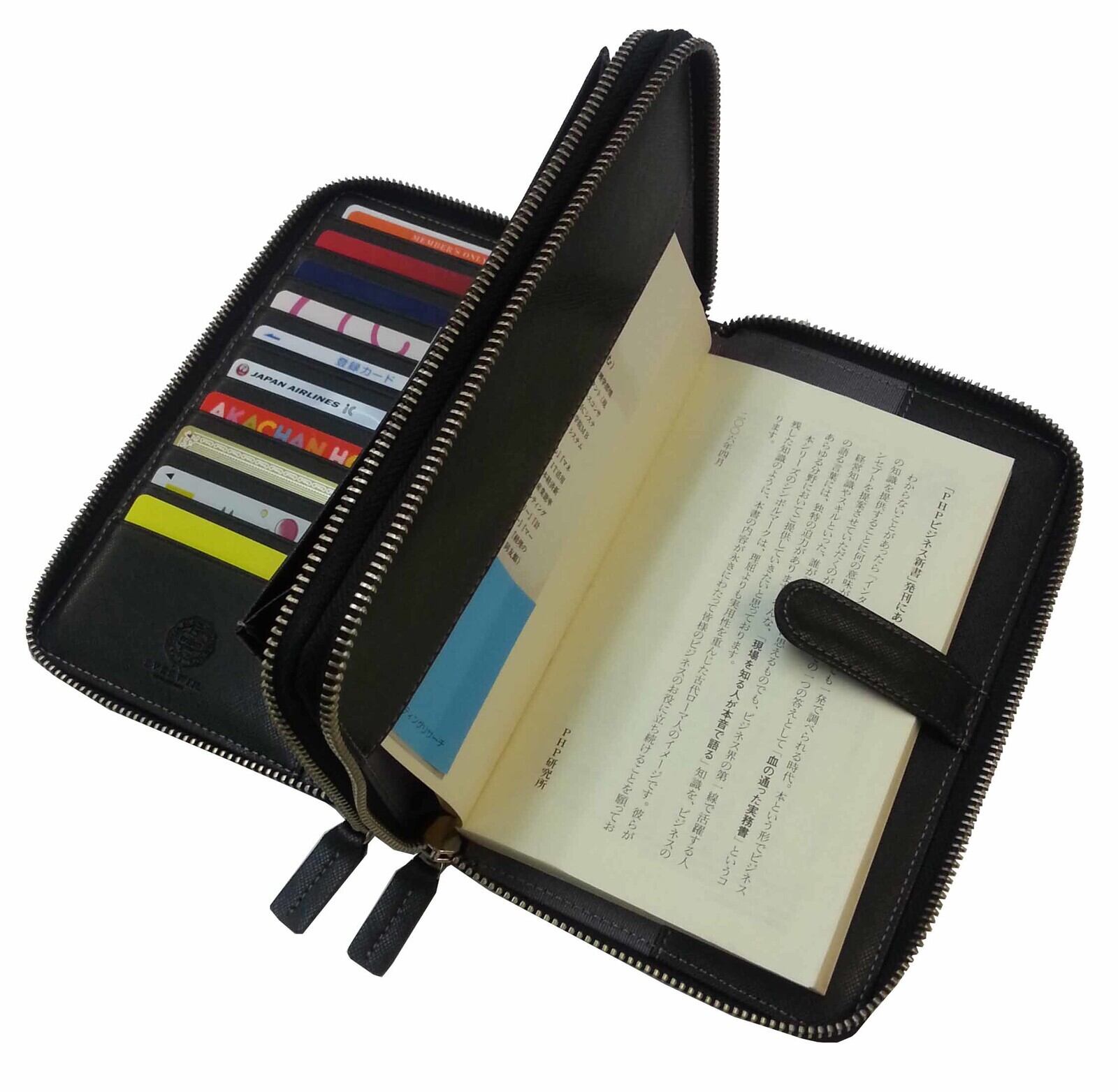 落ち着いたカラーを使用した牛革ブックホルダー付きマルチシステムウォレットです。内側には多数のポケットや仕切り、たくさんのカード入れを備え、機能的で収納力も抜群です。大きく開くラウンド型のファスナーだから中身を確認しやすく、取り出しもスムーズ。お財布としての役割を果たしてくれるので、ちょっとした外出ならこれ一つで十分に外出を可能にしてくれます。また、ブックホルダー機能付きというところも、電車やカフェでの時間も楽しいものになるでしょう。