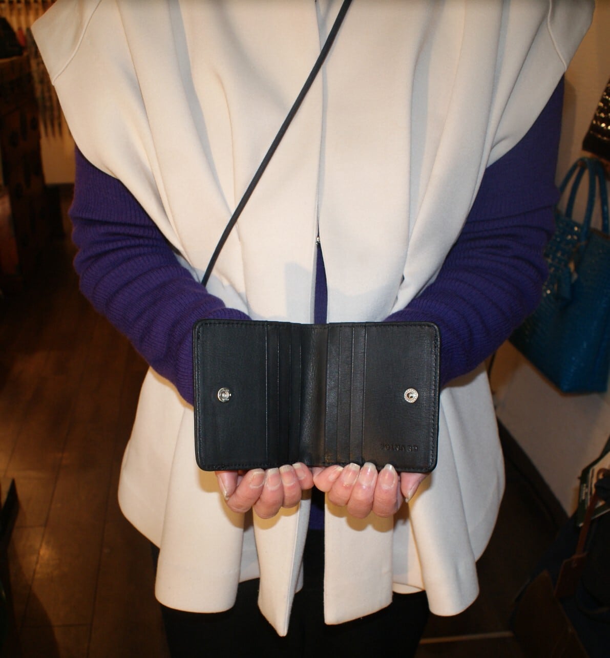 札入れが1カ所、カードは計8枚収納が可能。大きく開くボックス型の小銭入れで中が見渡しやすく、硬貨の出し入れがスムーズにできます。