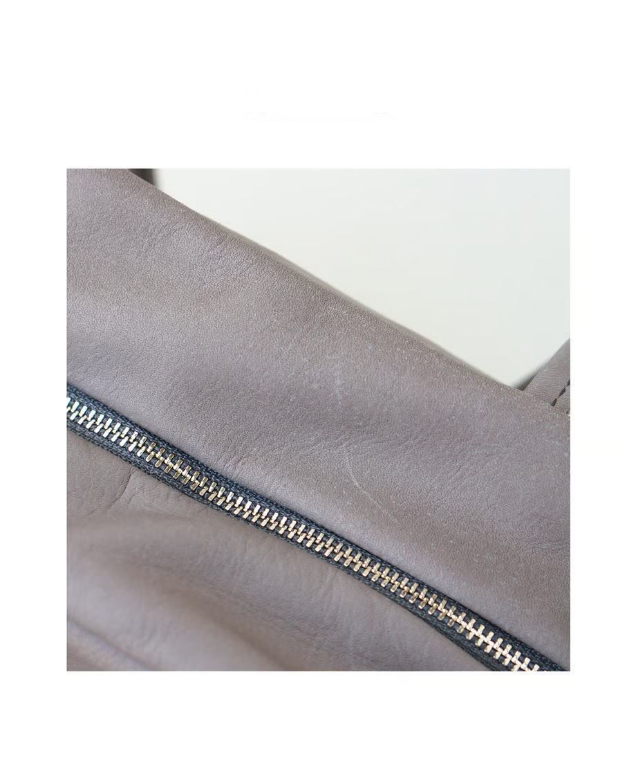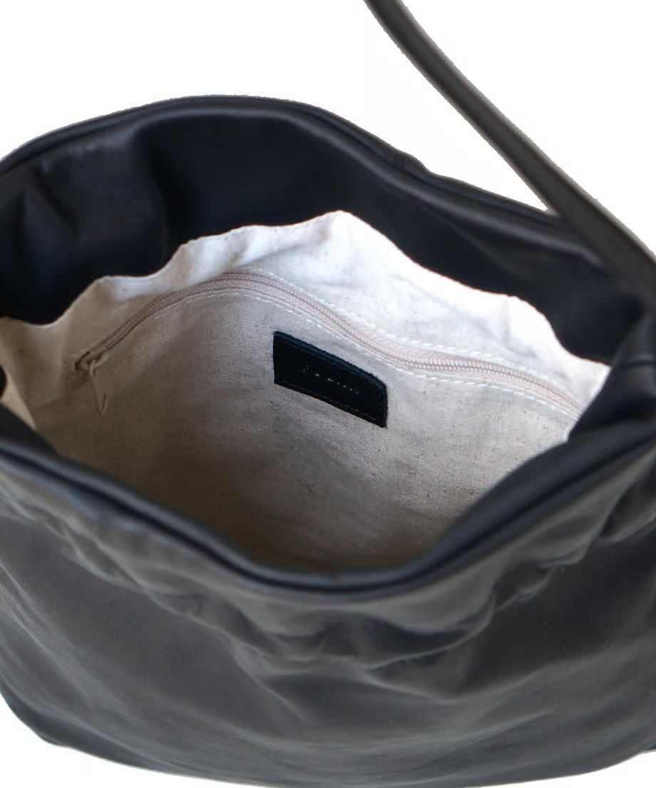 素材: 本体- 牛革/ 裏地- コットンリネン、開閉口: 巾着紐(ストッパー付き)