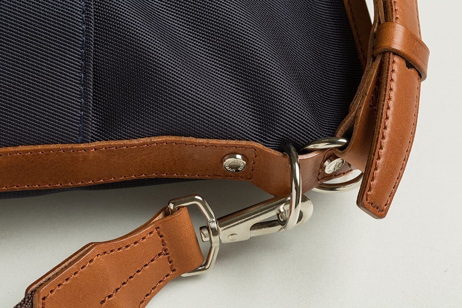 バッグ外装前面には、ドイツ製ホックが付いていて携帯電話や、パスケース等頻繁に出し入れする物の収納に適しています。 メインファスナーには、YKK社製“EVERBRIGHT”(“エバーブライト”は、銅合金製のエレメントを光沢研磨処理によって磨き、防錆処理と両面クリア塗装処理を施したファスナー)ストラップは厚手のナイロンテープを使用しています。 バッグ内装裏地には、スーツの裏地等に使用される上質なポリエステル素材ネイビー色のペンシルストライプを使用。 メイン収納部、前面側には、12cmのオープンポケットX3、ファスナーポケットは、ipadが入る等タブレット端末に対応する為 、テフロン加工を施した防水性に優れたナイロン生地を使用しています(30cm幅深さ22cm) 背面には貴重品などの収納に便利な口幅20cmのファスナーポケット、17cmのオープンポケットX2、ペン差しX2、等、大変機能的な仕様となっております。
