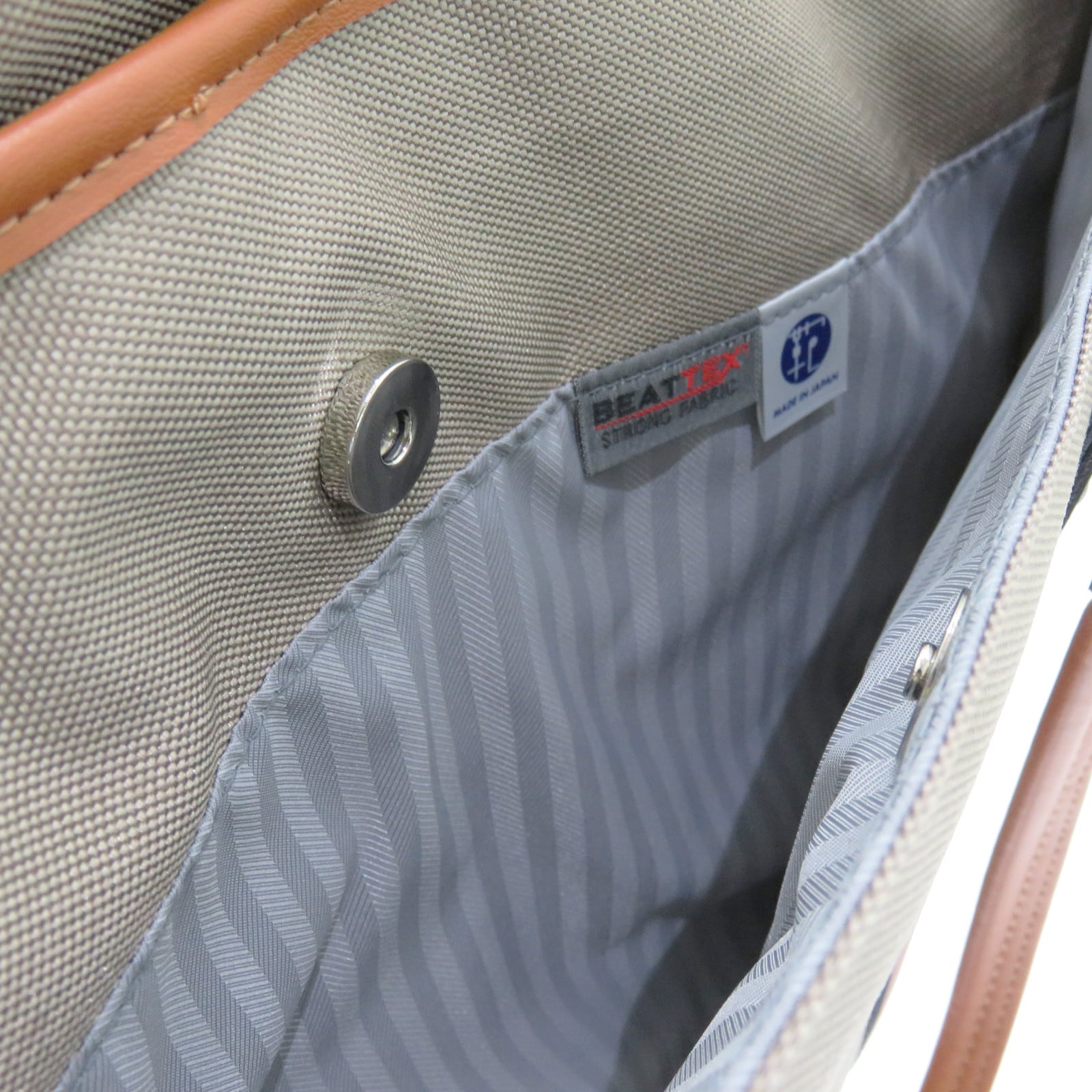本体はタイヤの厚いゴム層の中に鋳込まれる強力ナイロン糸(タイヤが受ける荷重・衝撃・充填空気圧耐える役割を持っています)を使用して織られた新素材「ビートテックス」を使用しています。生地の表面にはテフロン加工が施され、雨や汚れに強くなっています。本体に強度と発色性を併せ持つこの素材を使いトートタイプのビジネスバッグを仕立てました。