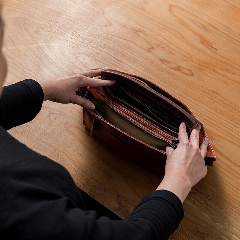 このバッグは、日本の職人が手作りで仕上げた一点ものです。繊細な縫製や美しい仕上げは、長く愛用できるという自信を持っています。また、レザーの風合いは使い込むほどに深まり、使うほどに愛着が湧いてきます。